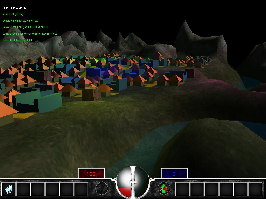 More progress. UI is in, roads are better supported. Work in progress main character model is in. Kent has been working on the town building and AI stuff.
